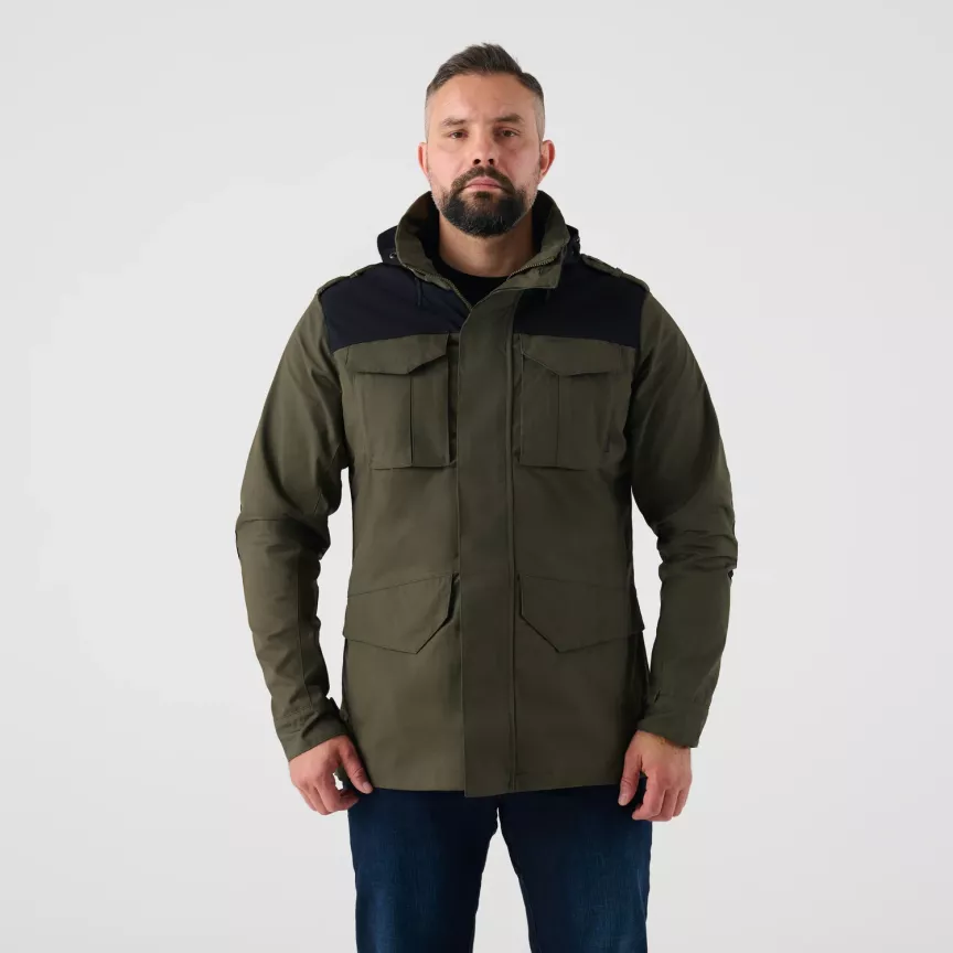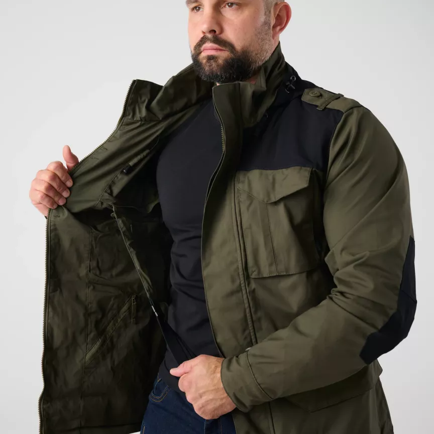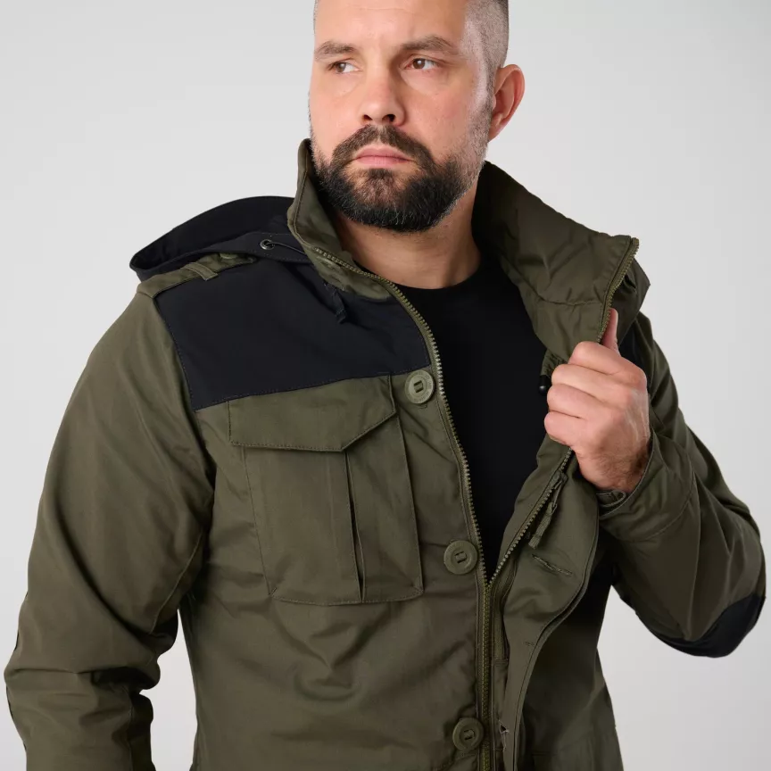 - Covert M65 jope on moodne välijope, mis põhineb ikoonilisel M65 mustril. See sobib ideaalselt salajasteks operatsioonideks, kus diskreetsus ja ebatavalised töömeetodid on olulised. Funktsionaalsete välistaskutega on see varustatud mugava kaasaskandmisega nii sooritusvõime kui ka enesekaitse jaoks vajalike esemete jaoks. Tänu vastupidavale DuraCanvas® kangale on see suurepärane valik ka igapäevaseks kasutamiseks, eriti sügisel ja talvel, mil see kaitseb kasutajat kerge vihma ja tuule eest. M65 jope ainulaadne patent on tasku, mida saab eemaldada ja kasutada eraldi puusakottina dokumentide või telefoni jaoks. Sees, sümmeetriliselt vasakul ja paremal küljel, on taskud ajakirjade jaoks. Kaks välistaskut külgedel võivad olla ka improviseeritud prügikotid. See klassikaline sõjaväejope on täiendavalt tugevdatud kahjustustele avatud kohtades ja varustatud krae sisse peidetud kapuutsiga. Eesmine osa on kinnitatud tugevate Kanada nööpide ja lahtikäiva lukuga, mis võimaldab jope koheselt avada.