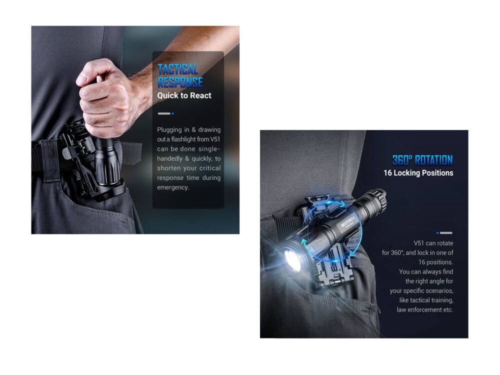 NEXTORCH V51 kiirkinnitusega taktikalise taskulambi kinnitus on klassikalise V5 edasiarendus, millel on täiustatud vööklamber: seda saab vabalt eemaldada ning see ühildub kuni 55 mm laiuste vöödega ja MOLLE-kinnitusega. Nagu V5, on ka V51 360° pööratav ja 16 lukustusasendiga. Lisaks taskulambi õige nurga all hoidmisele ja paigutamisele võimaldab V51 teil taskulambi kiiresti välja tõmmata või kindlalt lukustada.