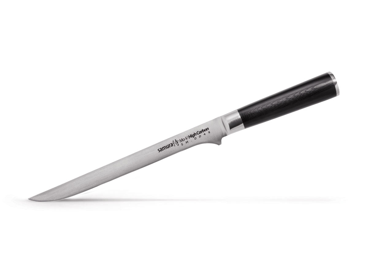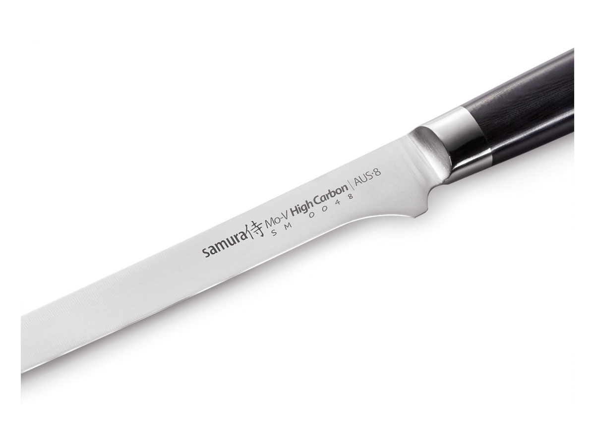 Professionaalsed kööginoad on valmistatud AUS-8 roostevabast terasest ja ergonoomilise kumera G-10 käepidemega – ideaalne kvaliteedi ja taskukohase hinna kombinatsioon. Ergonoomiline G-10 käepide pakub täielikku kontrolli lõikamisel. G-10 on vastupidav materjal, mida kasutatakse nii matka- kui ka ellujäämisnugade valmistamisel. Antimikroobne terasest käepide sobib ideaalselt professionaalidele. Tänu roostekindlale molübdeen-vanaadiumterasele vastab SAMURA Mo-V seeria laia klientide, nii harrastus- kui ka professionaalsete kokkade, vajadustele. Teral on kahepoolne Euroopa teritus sujuva kaldega.